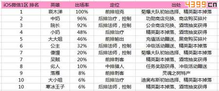 6.安卓1区的出场英雄种类比IOS区多了一种,就是奕莫塔,而且奕莫塔还有26%的出场率。