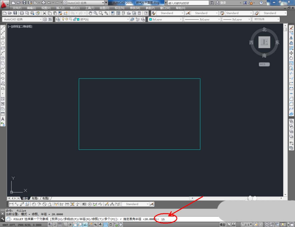 3、点击右边工具栏中的【圆角工具】,在命令栏中输入:r并按下空格键,继续如何数值:15并按下空格键确定,鼠标按图示拾取图案上相邻的两条线段进行圆角处理。同样的步骤,完成另外三个角的圆角处理(如图所示);