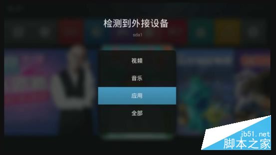 2、将下载好的文件转移到U盘,然后将U盘插入到天猫魔盒M17的USB接口,这时电视屏幕会自动弹出提示窗口,请点击“应用”:
